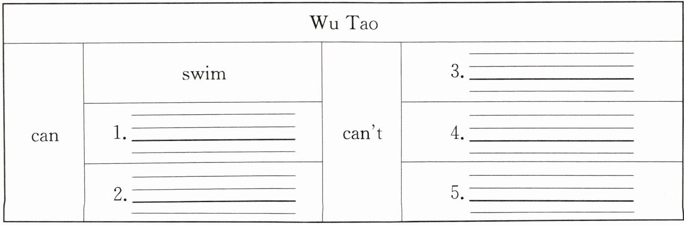 1.sing songs 2.play basketball 3.skate 4.dance 5.play ping-pong