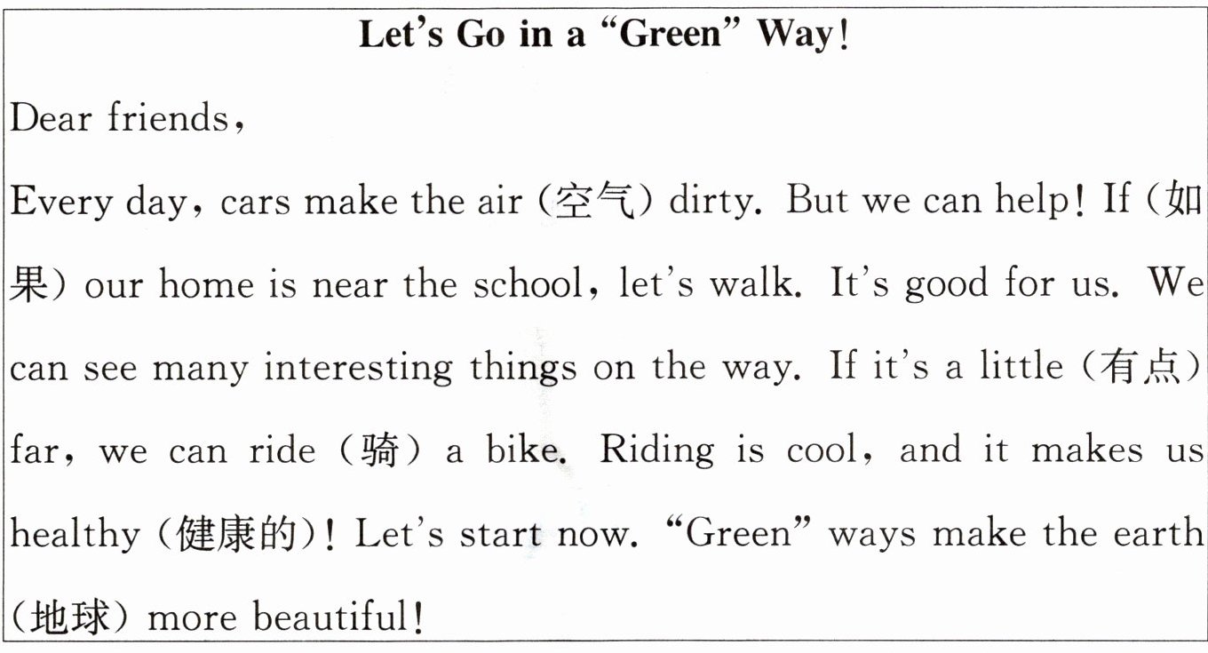 Every day,cars make the air (空气) dirty. But we can help! If (如果) our home is near the school,let's walk. It's good for us. We can see many interesting things on the way. If it's a little (有点) far,we can ride (骑) a bike. Riding is cool,and it makes us healthy (健康的)! Let's start now. “Green” ways make the earth (地球) more beautiful!
