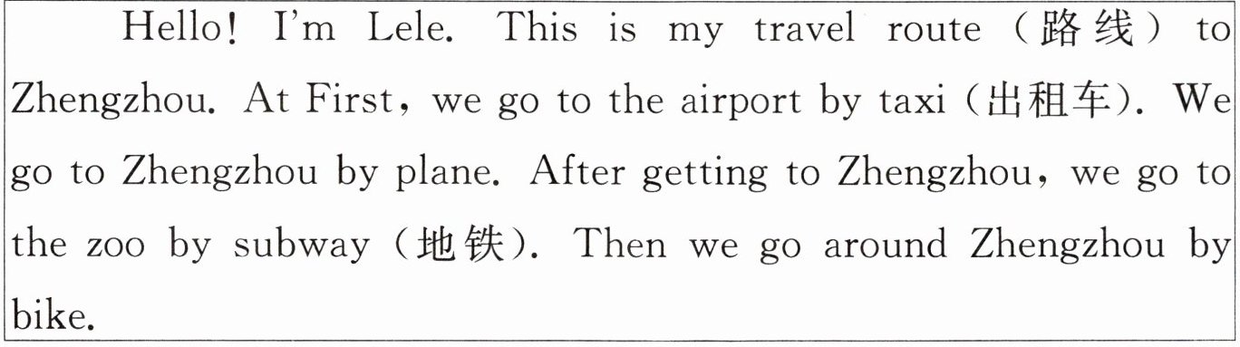 Hello! I’m Lele. This is my travel route(路线)to Zhengzhou. At First, we go to the airport by taxi(出租车). We go to Zhengzhou by plane. After getting to Zhengzhou, we go to the zoo by subway(地铁). Then we go around Zhengzhou by bike.