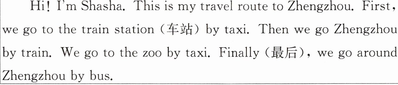 Hi! I’m Shasha. This is my travel route to Zhengzhou. First, we go to the train station(车站)by taxi. Then we go Zhengzhou by train. We go to the zoo by taxi. Finally(最后),we go around Zhengzhou by bus.