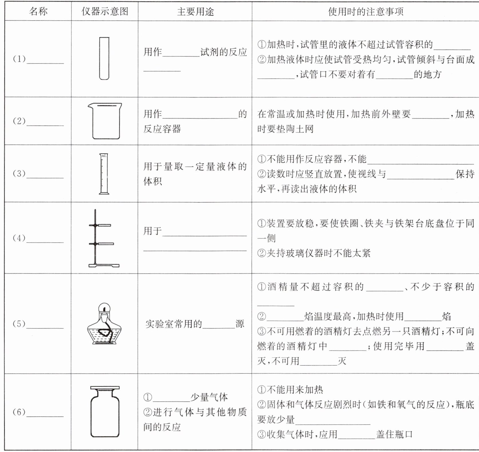 |(1)______||用作______试剂的反应______|①加热时,试管里的液体不超过试管容积的______