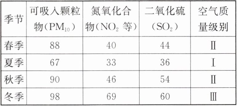 |季节|可吸入颗粒物$(PM_1₀)$|氮氧化合物$(NO_2$等)|二氧化硫$(SO_2)$|空气质量级别|