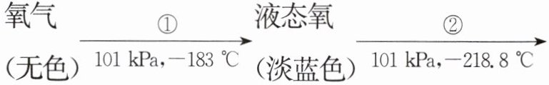 氧气(无色$)\xrightarrow[101kPa,-183℃]{①}$液态氧(淡蓝色$)\xrightarrow[101kPa,-218.8℃]{②}$固态氧(淡蓝色)
