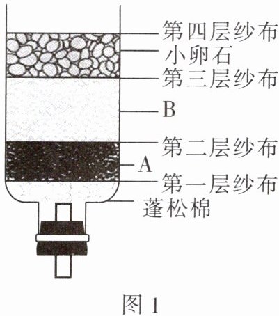 (1)图1是用空塑料瓶、带导管的单孔橡胶塞、蓬松棉、纱布、活性炭、小卵石、石英砂等材料自制的一个简易净水器。