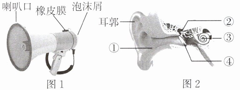 1. 图 2 是人耳的基本结构示意图。小秦对着图 1 喇叭口说话时,可以观察到泡沫屑跳动的现象,在此过程中,外界声波由收集声波的喇叭口经喇叭管模拟的[____]______传至橡皮膜时,橡皮膜会产生振动,从而引起泡沫屑跳动,橡皮膜可用来模拟[____]______。声波的可视化呈现是该装置的最大优势。