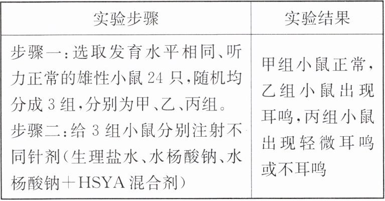 有研究指出,水杨酸钠(一种药物)会引发耳鸣,而从中药“红花”中提取的羟基红花黄色素 A(HSYA)能缓解水杨酸钠引发的耳鸣。为了验证此结论,学习小组的同学在研究人员的指导下设计了如下实验。