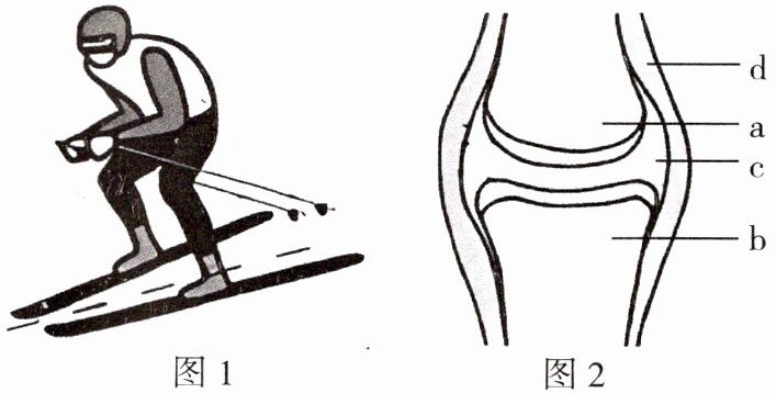 (2)滑雪运动速度快,危险性强。为了尽可能减少运动损伤,专业人员提出了一些建议:①过量运动会使图2中的______磨损,骨与骨之间的摩擦增加,导致膝关节疼痛,因此需要做好充分的热身活动,促进分泌滑液到______(填字母)中,使关节更加灵活;②规范佩戴护具,护具紧实的包裹可避免关节受伤,护具与关节结构中的______(填字母)具有相似的作用。