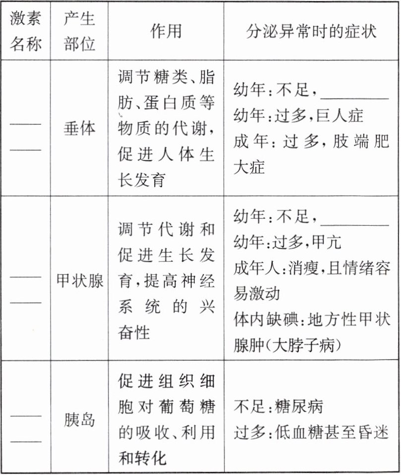 |______|垂体|调节糖类、脂肪、蛋白质等物质的代谢,促进人体生长发育|幼年:不足,______