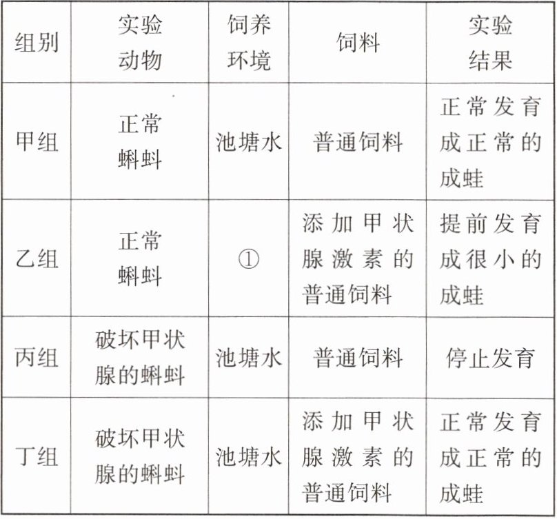 |乙组|正常蝌蚪|①|添加甲状腺激素的普通饲料|提前发育成很小的成蛙|