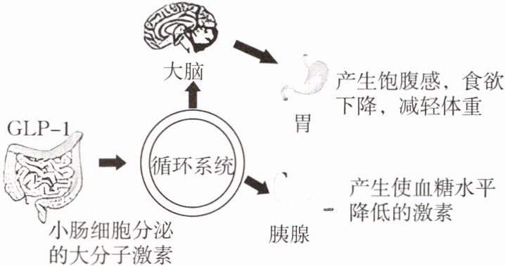 权威科学期刊Science将GLP-1类药物评为年度十大科学突破。GLP-1是由小肠细胞分泌的一种大分子多肽类激素,可以刺激某内分泌腺分泌能降低血糖的激素、抑制食欲、减缓胃排空,其部分作用机理如下图所示。在临床使用中发现,GLP-1类药物不仅让糖尿病患者和肥胖症患者受益,还可以减少患中风、心衰等心脑血管疾病的风险。