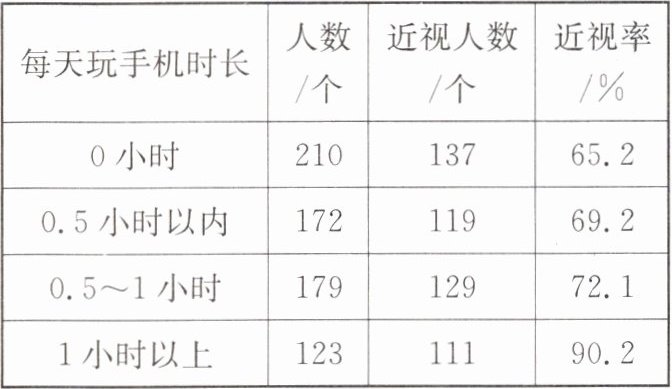 |每天玩手机时长|人数/个|近视人数/个|近视率/%|