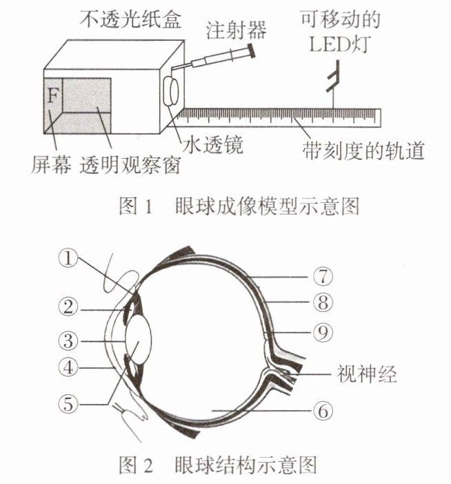 某班同学要探究眼球成像的奥秘,利用水透镜和其他材料制作了人体眼球成像模型(图1),图2是眼球的结构示意图。请你观察模型并结合眼球结构示意图,回答下列问题([]中填图中序号)。