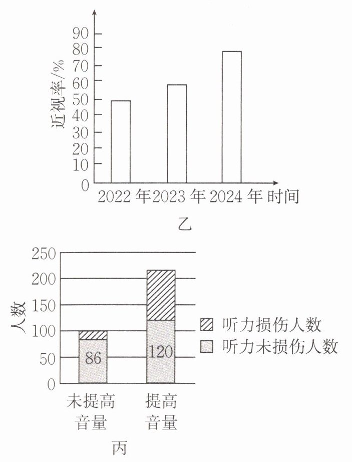 3. 图乙表示某校学生三年近视率调查结果,其变化趋势反映了什么问题?图丙是调查学生在嘈杂环境中是否提高耳机音量与听力损伤的情况统计图。据此,研究人员提出了“在嘈杂环境中不建议提高耳机音量”的倡议,他们的依据是什么?