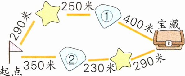 (2)290+250+400=940(米) 350+230+290=870(米) 870<940,最短寻宝路线的长度是 870 米。