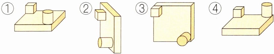 ①和③是相同的。[解析]观察4幅图发现,①②③中正方体和圆柱均处于对角,④中正方体和圆柱在同一边。①③中正方体和圆柱靠边,②中正方体和圆柱靠里,所以物体①和③相同。