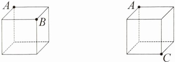 4. 下图的正方体盒子上,一只蚂蚁要从点 A 爬到点 B,怎么爬最近?从点 A 爬到点 C 呢?在图中分别画一画。