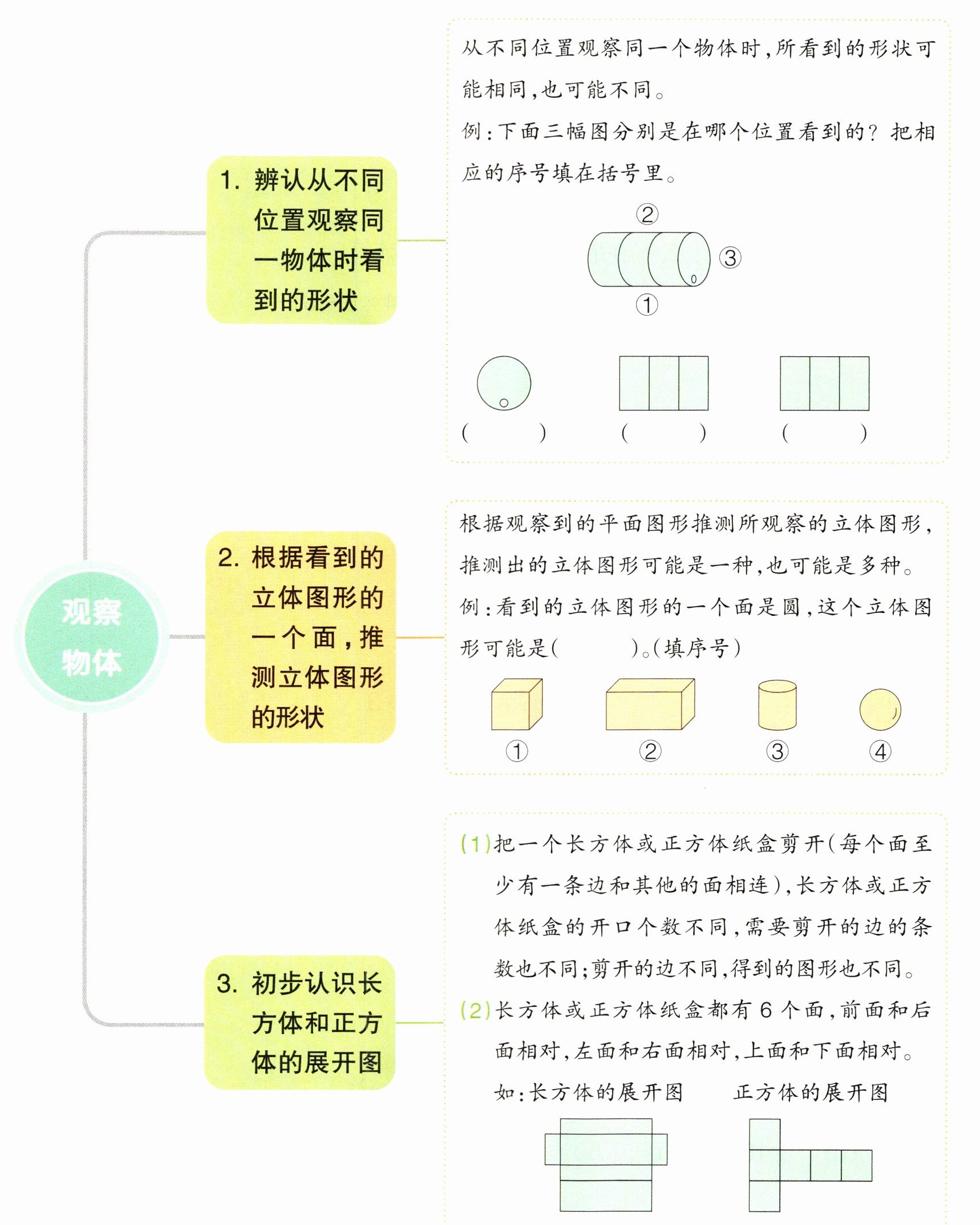 (1)把一个长方体或正方体纸盒剪开(每个面至少有一条边和其他的面相连),长方体或正方体纸盒的开口个数不同,需要剪开的边的条数也不同;剪开的边不同,得到的图形也不同。