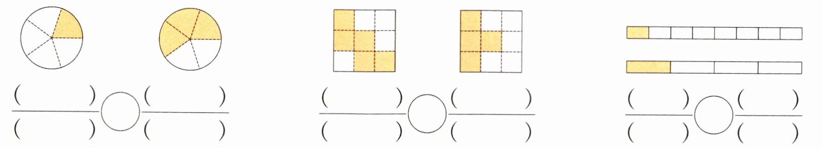 $\frac{1}{5}<\frac{3}{5}$ $\frac{5}{9}>\frac{4}{9}$ $\frac{1}{8}<\frac{1}{4}$