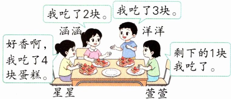 1. 妈妈将宴会上的一个蛋糕平均分成了若干块,4 个小朋友分着吃(如图)。