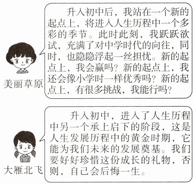 (1)跨进中学校园,我们有了一个新的身份——中学生!这意味着一段新的生命旅程的开始,新环境、新老师、新同学……
