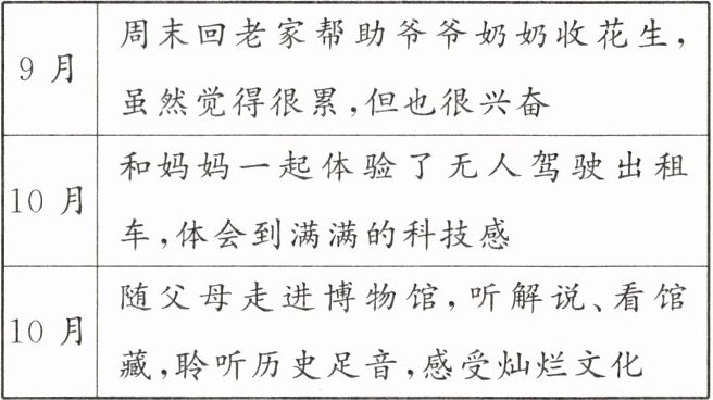 | 9月 | 周末回老家帮助爷爷奶奶收花生,虽然觉得很累,但也很兴奋 |