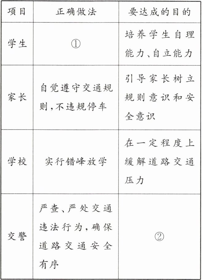 (1)①乘坐公共交通工具上下学 ②增强公民的法治意识和规则意识,引导人们自觉遵守交规