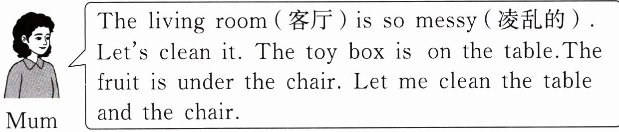 The living room (客厅) is so messy (凌乱的). Let's clean it. The toy box is on the table. The fruit is under the chair. Let me clean the table and the chair.