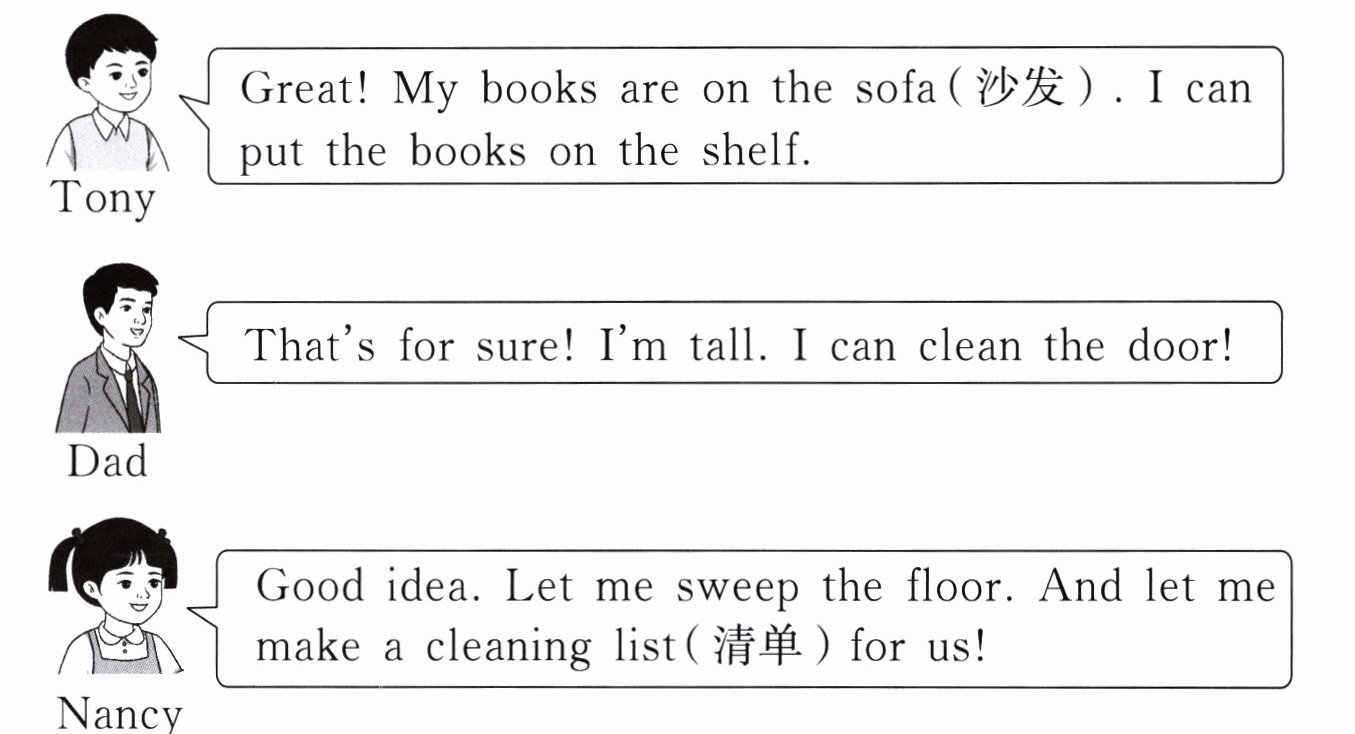 Ⅲ. Read and finish the tasks. (Tony 和他的家人们正讨论为客厅做大扫除,阅读他们的对话,完成下列任务。)