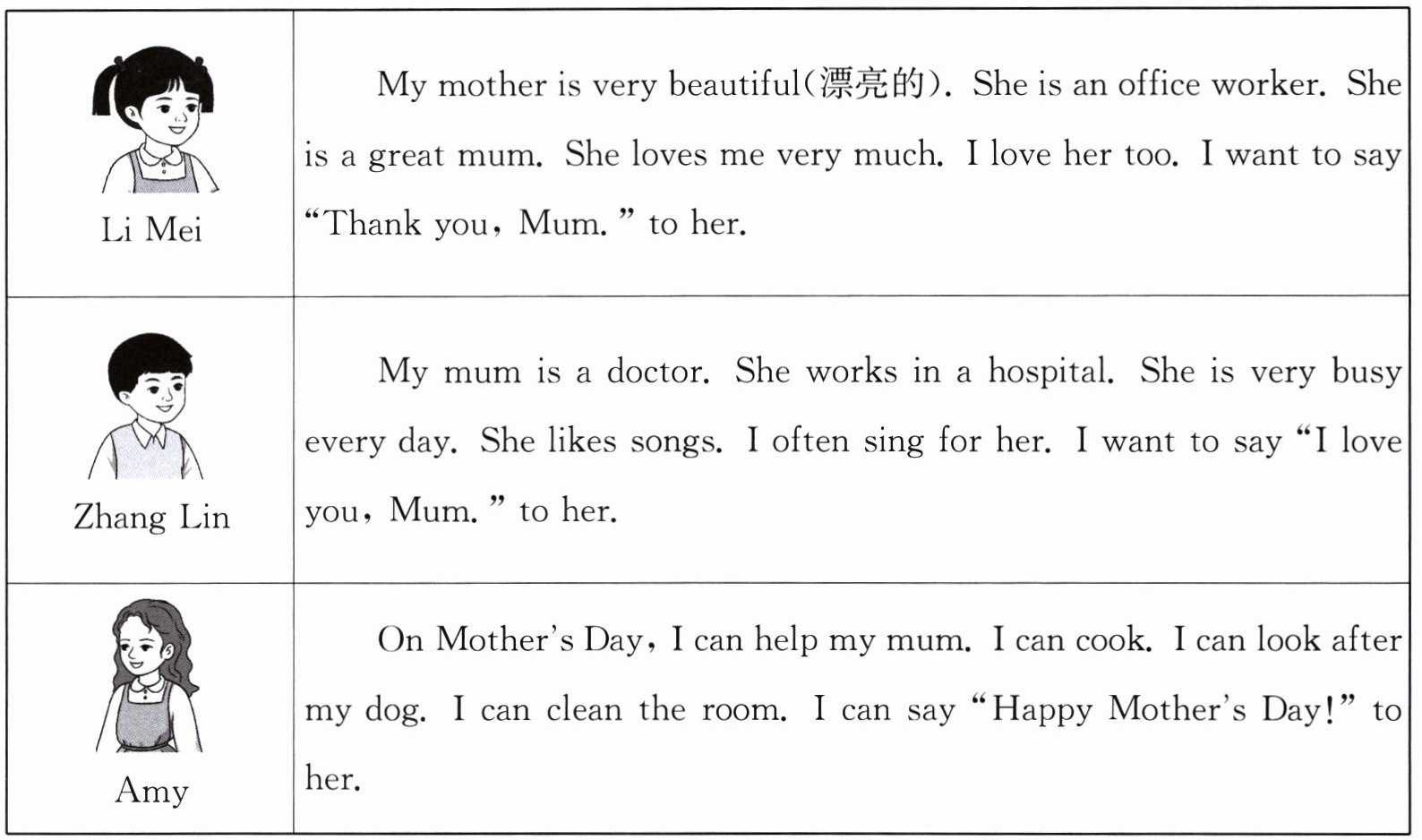 ||My mother is very beautiful(漂亮的). She is an office worker. She is a great mum. She loves me very much. I love her too. I want to say "Thank you, Mum." to her.|