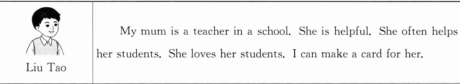 ||My mum is a teacher in a school. She is helpful. She often helps her students. She loves her students. I can make a card for her.|