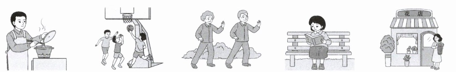 Look at my family photo! This is my family. We all love our community. My grandparents are kind. Every day,they go to the park to do taijiquan with their old friends. They are happy. My dad is a teacher. He goes to a shop to buy food. He can make good noodles,and they’re my family’s favourite. My mum is a doctor. She often goes to the flower shop in the community and buys flowers for our home. My brother is a student. At weekends,he plays basketball with his friends in the park. They have fun. I’m a student too. I often sit(坐) on a chair and read books in the park.
