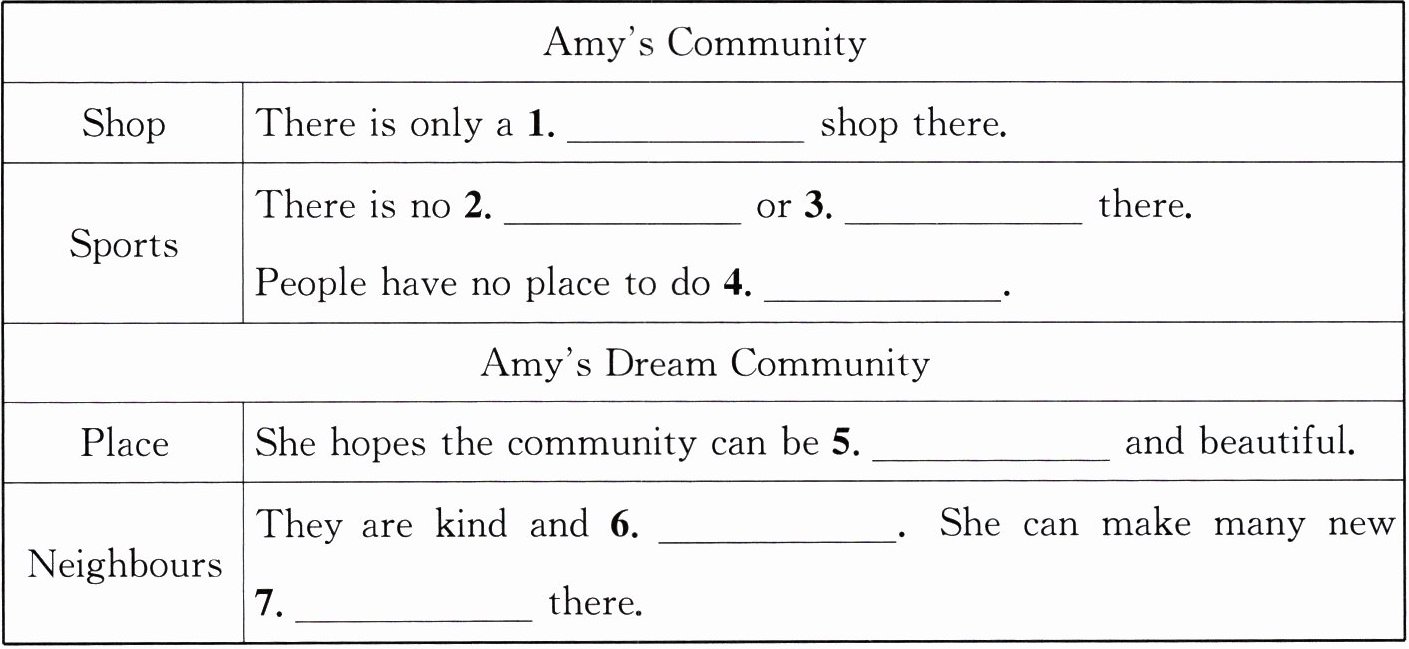 Amy hopes (希望) to live in a new community. Her dream community is big and beautiful. There is a library, a museum, a big supermarket and a big park. People can do a lot of things there. The neighbours are kind and helpful. She can make many new friends.