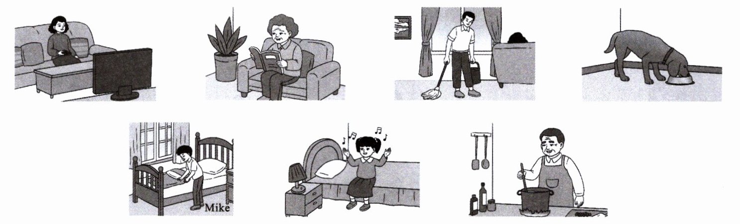 任务二:根据图片,仿照任务一中的句子,写一下 Mike 的姐姐和奶奶正在做的事情。