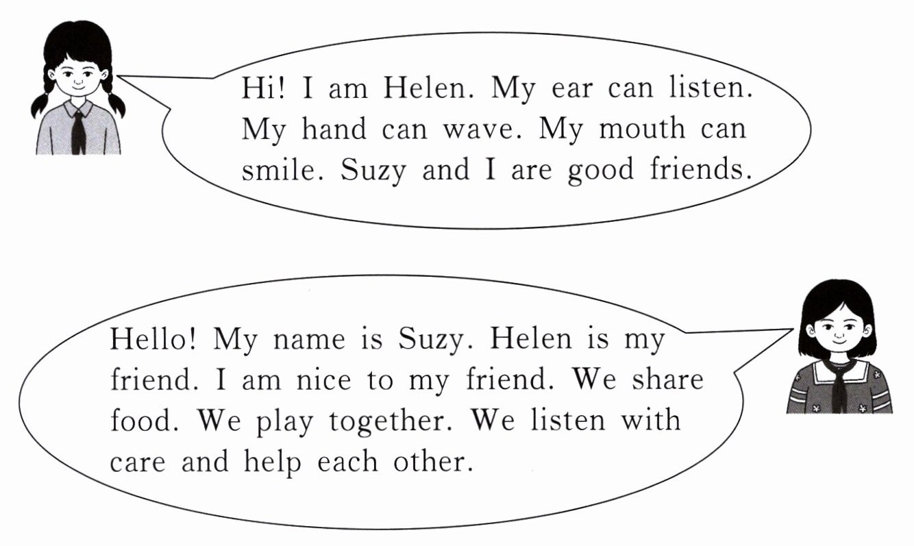 Hello! My name is Suzy. Helen is my friend. I am nice to my friend. We share food. We play together. We listen with care and help each other.