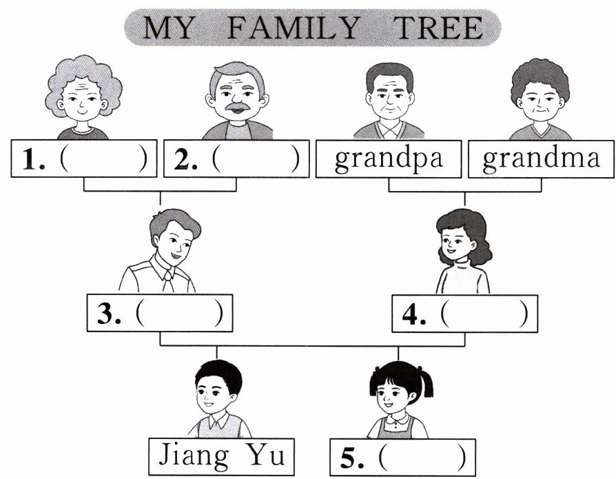 Ⅳ. Look and choose. (根据图片,选择正确的单词补全 Jiang Yu 的家谱。)