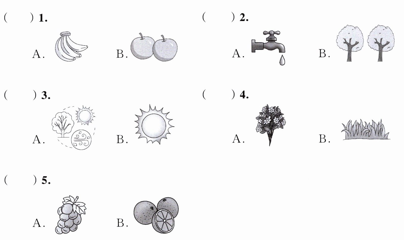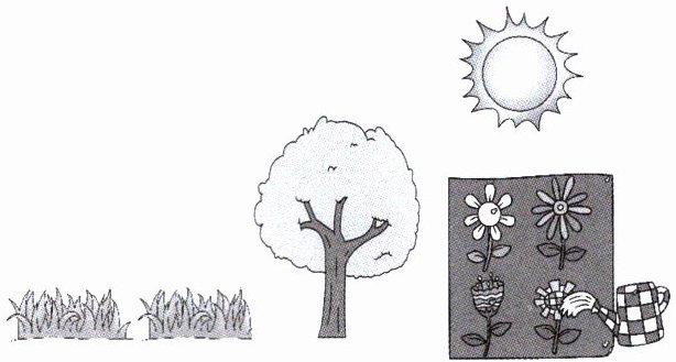 圈出 grass、flowers、sun、tree、water