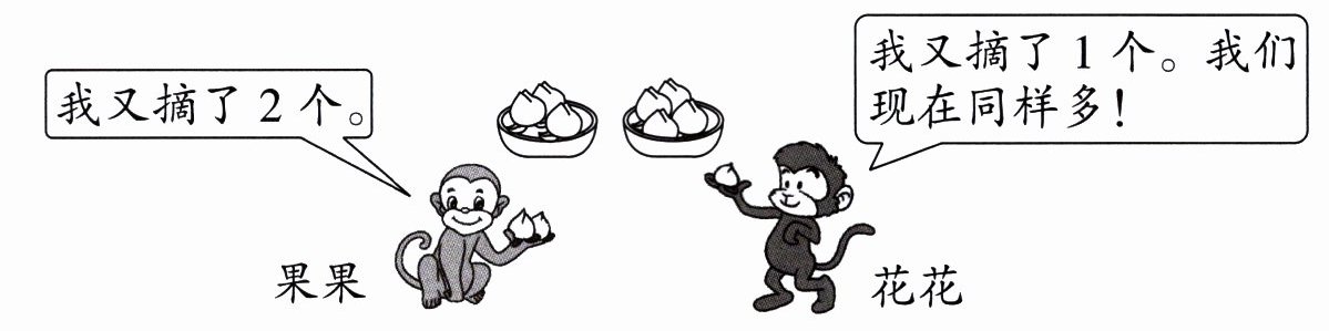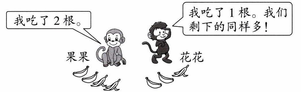 [思路分析]由题意可知,果果先摘了 3 个桃子,又摘了 2 个桃子,所以果果一共摘了 5 个桃子。花花先摘了 4 个桃子,又摘了 1 个桃子,一共也摘了 5 个桃子,所以 $3 + 2 = 4 + 1$。第 2 个故事同理,果果有 4 根香蕉,吃了 2 根香蕉,剩下 2 根香蕉。花花有 3 根香蕉,吃了 1 根香蕉,还剩下 2 根香蕉,所以 $4 - 2 = 3 - 1$。