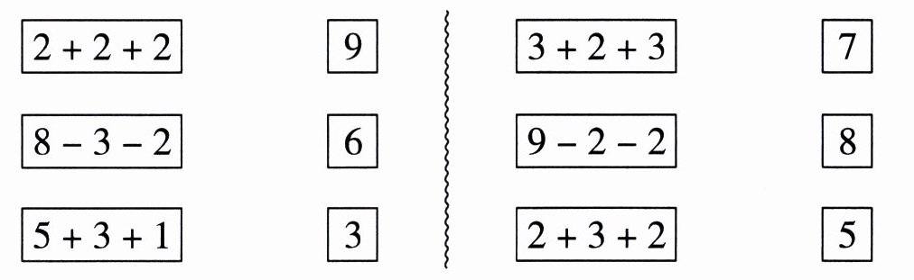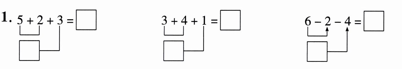 $\begin{array}{c}□\\\end{array}\begin{array}{c}□\\ 2. 4 + 0 + 5 = □ 3 + 4 + 3 = □ 2 + 3 + 4 = □ 9 - 2 - 3 = □ 10 - 6 - 4 = □ 10 - 3 - 5 = □$