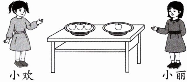 小欢和小丽有 4 个苹果。小欢分得了 3 个,小丽分得了 1 个。这样的分法公平吗? 怎样分,才能让她们的苹果一样多?