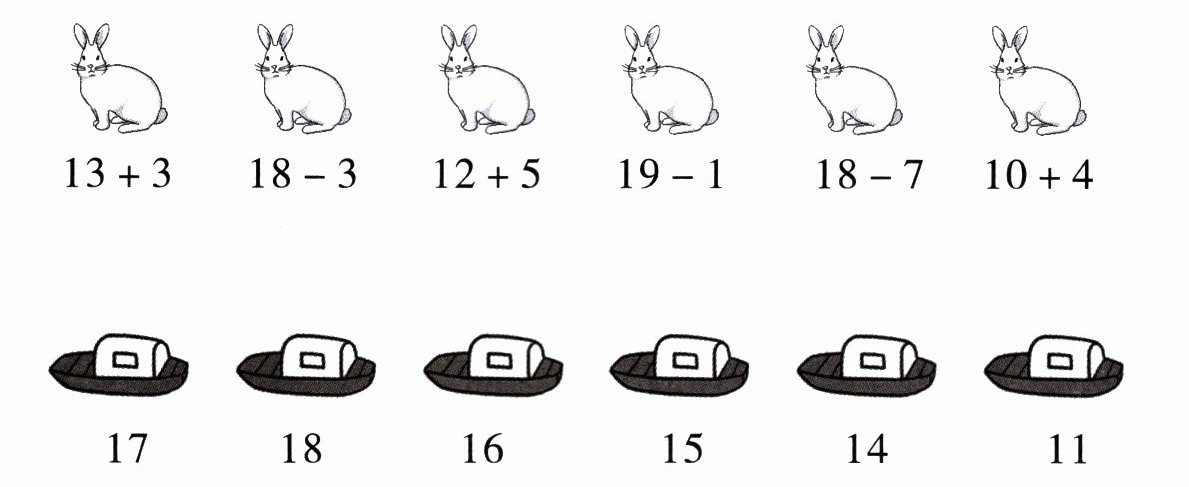 $16 + 3 = □$ $18 - 2 = □$ $16 - 5 = □$ $18 - 8 = □$