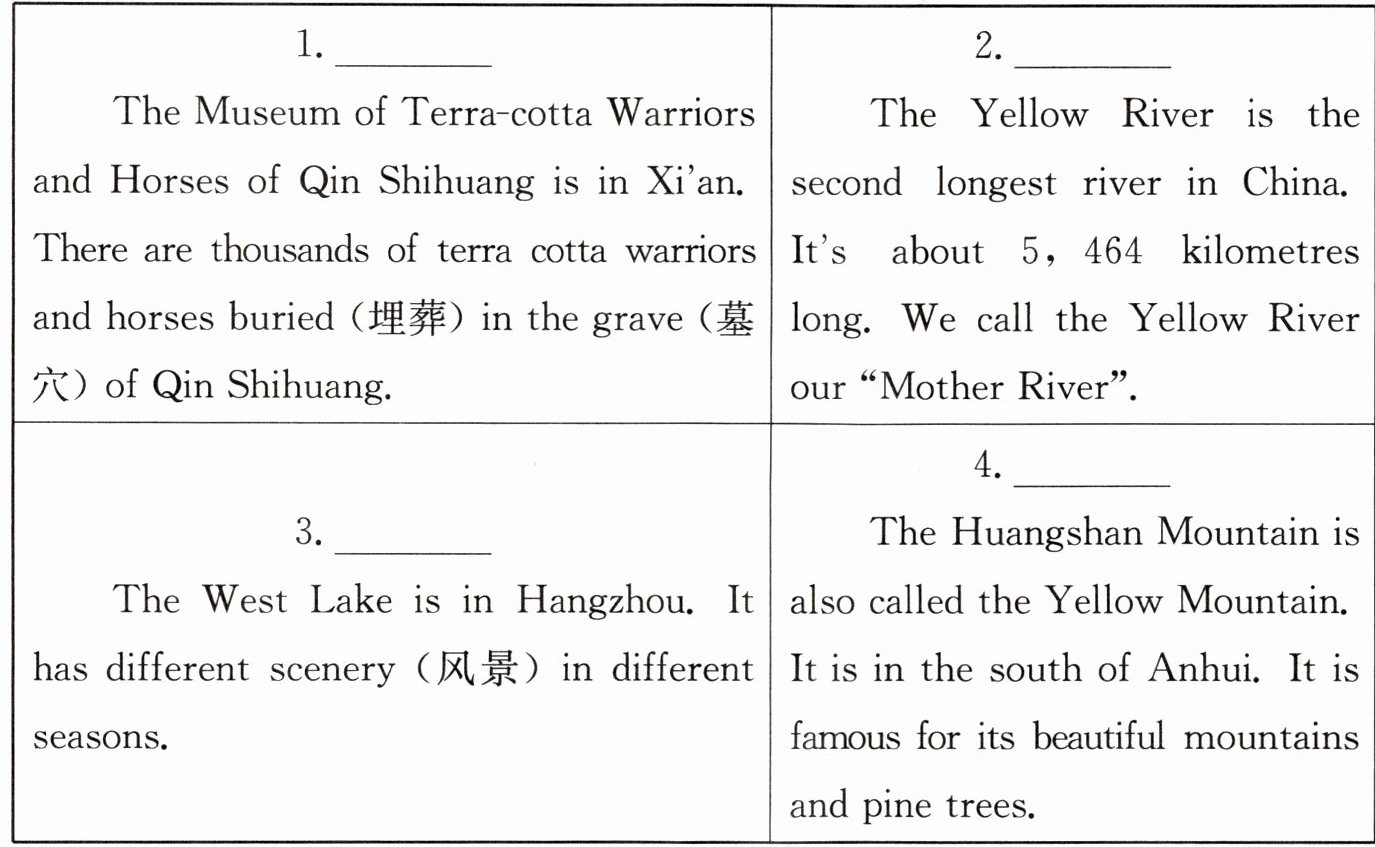 任务一:1~4 BDAC 任务二:1. 勇士;战士 2. We call the Yellow River our “Mother River”. 3. Yes, there are.