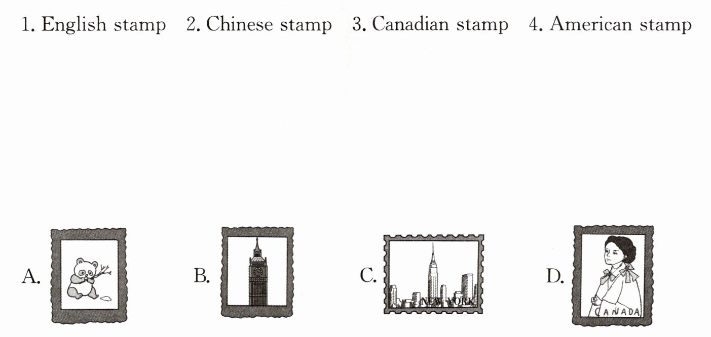 1. English stamp 2. Chinese stamp 3. Canadian stamp 4. American stamp