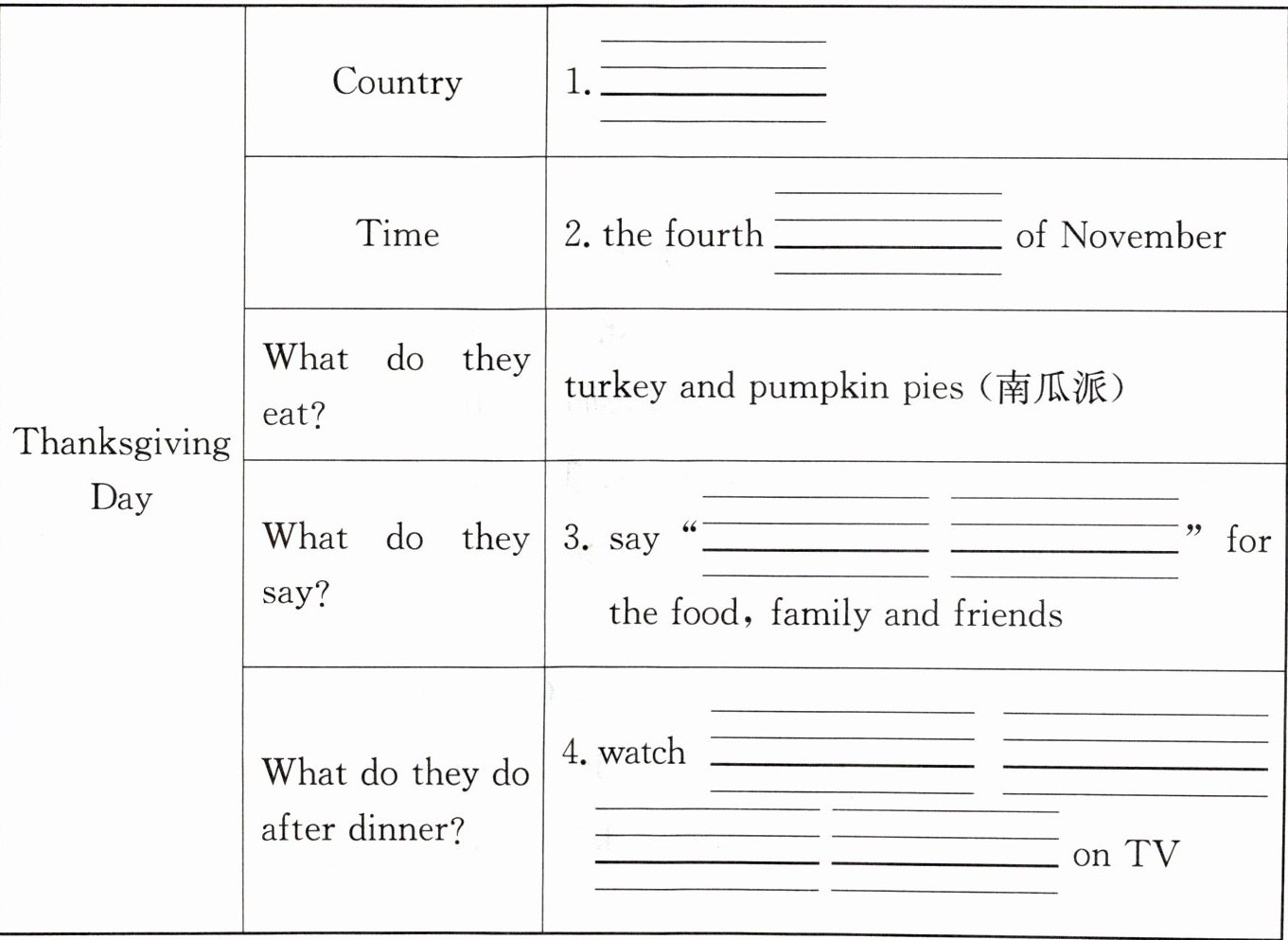 五、Read and fill. 查询资料,完成感恩节资料卡。