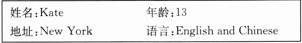 I’m Kate. I’m 13 years old. I live in New York. I can speak English and Chinese. I like collecting stamps. I’ve got a pet cat. It’s very cute.