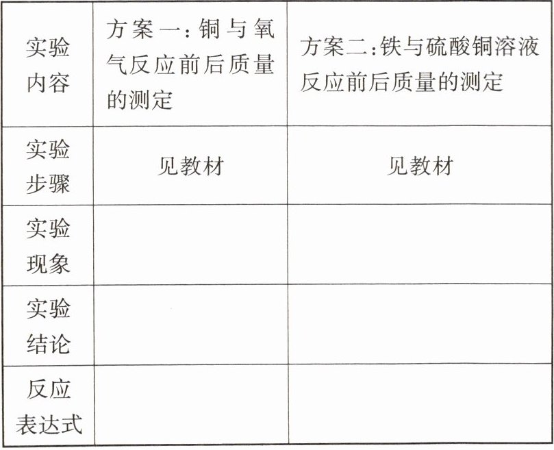 |实验内容|方案一:铜与氧气反应前后质量的测定|方案二:铁与硫酸铜溶液反应前后质量的测定|