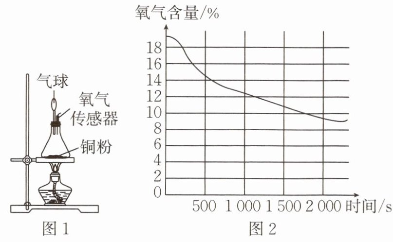 15. 某化学兴趣小组开展化学反应前后物质的质量关系探究,实验装置如图 1 所示,测得锥形瓶中氧气含量的变化过程如图 2。下列说法正确的是( )