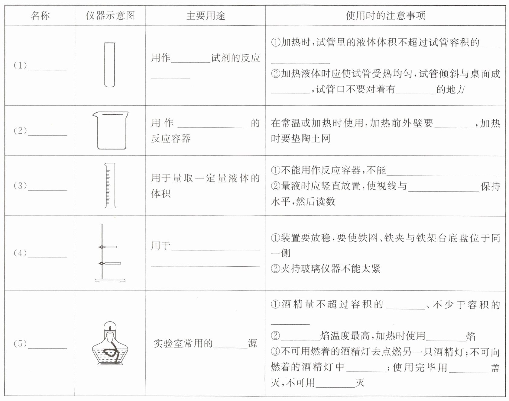 |(5)______||实验室常用的______源|①酒精量不超过容积的______、不少于容积的______