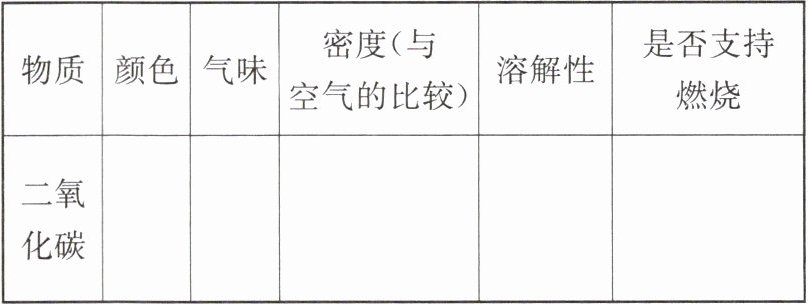 |物质|颜色|气味|密度(与空气的比较)|溶解性|是否支持燃烧|