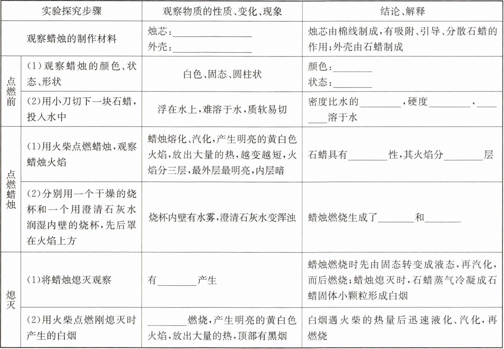 (2)分别用一个干燥的烧杯和一个用澄清石灰水润湿内壁的烧杯,先后罩在火焰上方|蜡烛熔化、汽化,产生明亮的黄白色火焰,放出大量的热,越变越短,火焰分三层,最外层最明亮,内层暗