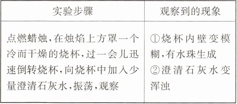 |点燃蜡烛,在烛焰上方罩一个冷而干燥的烧杯,过一会儿迅速倒转烧杯,向烧杯中加入少量澄清石灰水,振荡,观察|①烧杯内壁变模糊,有水珠生成